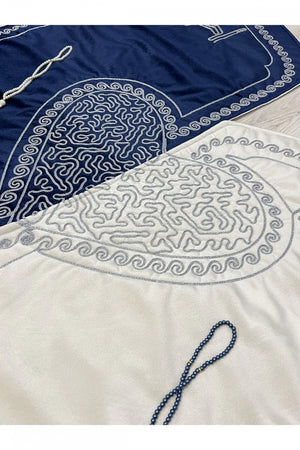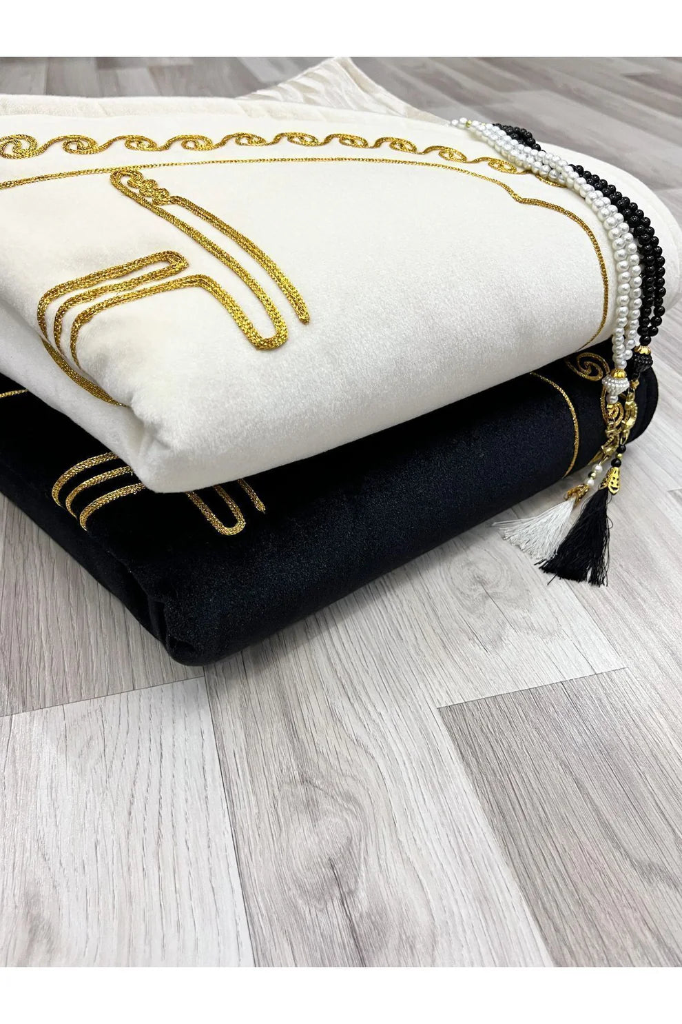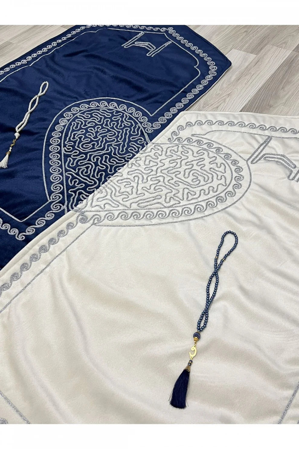 Her bir seccade yüksek kaliteli kadife kumaştan üretilmiştir ve altın renkli parlak varak işlemeleri ile şıklık kazanmıştır. Setin içerisinde ayet-el kürsi yüzük ve tesbih de bulunmaktadır.